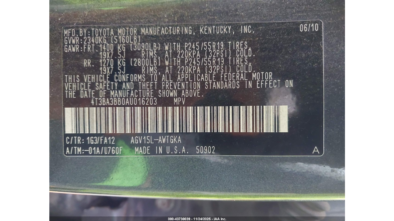 Vin Number 4T3BA3BB0AU016203